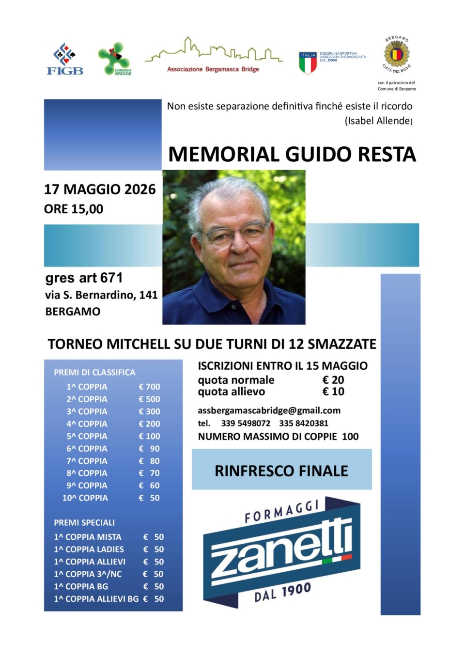 Domenica 17 maggio, presso il gres art 671, in Via San Bernardino 141 a Bergamo, si terrà il torneo in memoria di Guido Resta. Sono previste massimo 100 coppie, si consiglia agli interessati di iscriversi in tempo.
